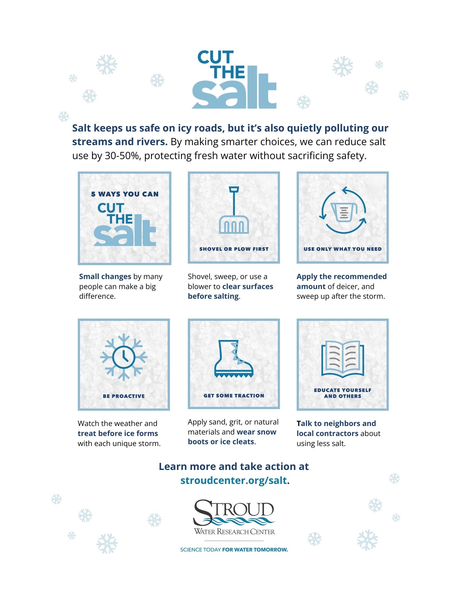 The “5 Ways to Cut the Salt” message is available in several formats for individuals and organizations to share with HOAs, local businesses, social networks, and more. Thanks for helping the Stroud Center spread the word!